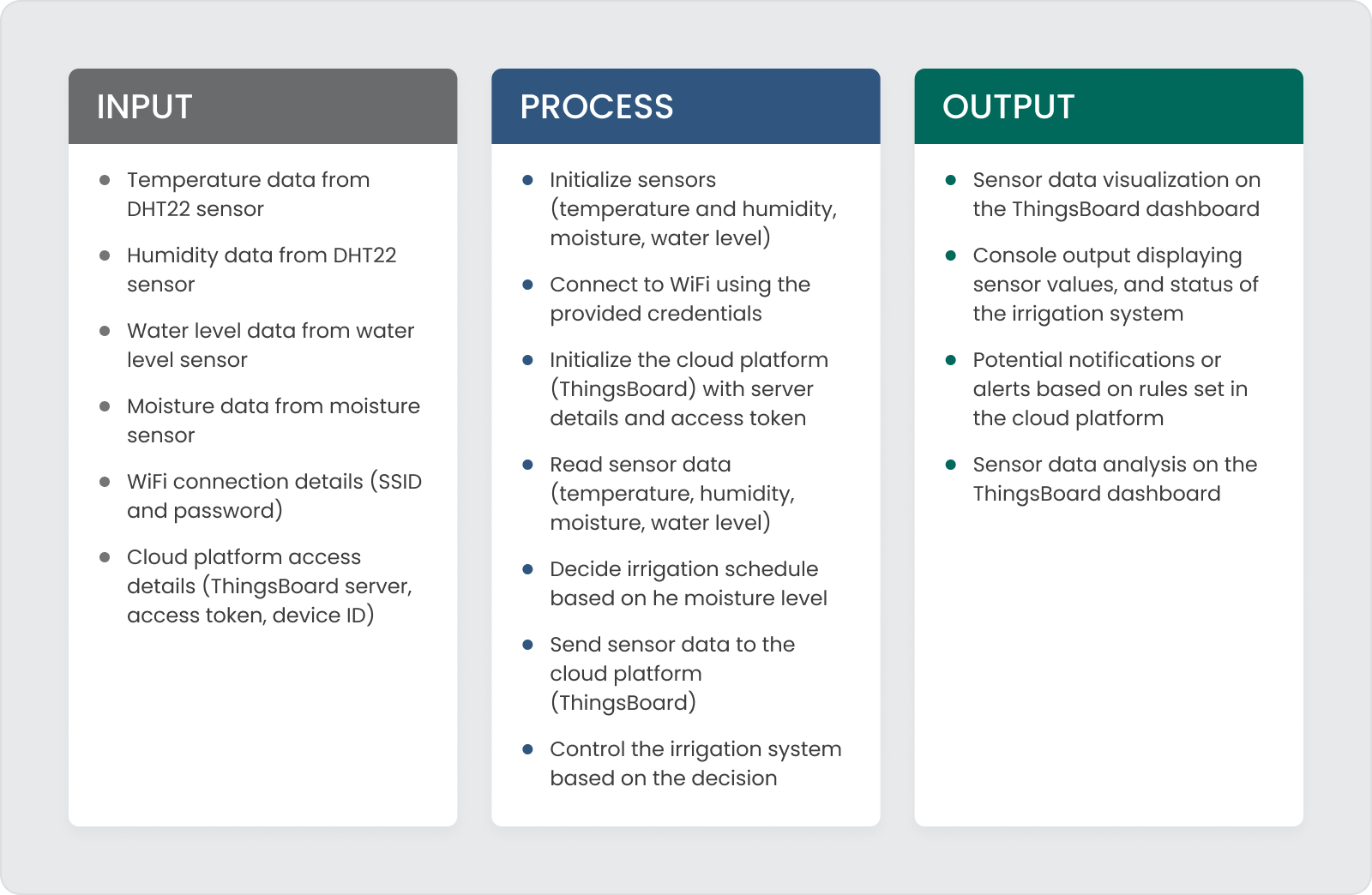 A key feature of this system is its smart algorithm. It analyses data from sensors to determine when and how much water is needed, ensuring efficient irrigation and avoiding waste. The system automates pump activation based on predefined thresholds and provides email notifications to alert farmers of any critical conditions, such as low water levels or irregularities in the system’s operation.