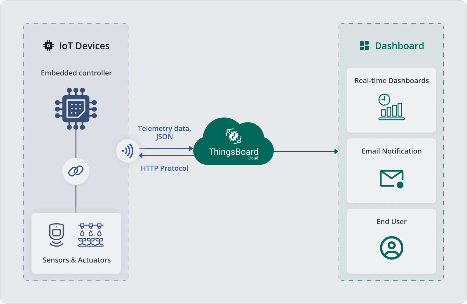 2. ThingsBoard Cloud: This is the brain of the operation. ThingsBoard manages the data, applies automation rules (like starting irrigation pumps when the soil gets too dry), and ensures everything runs smoothly.