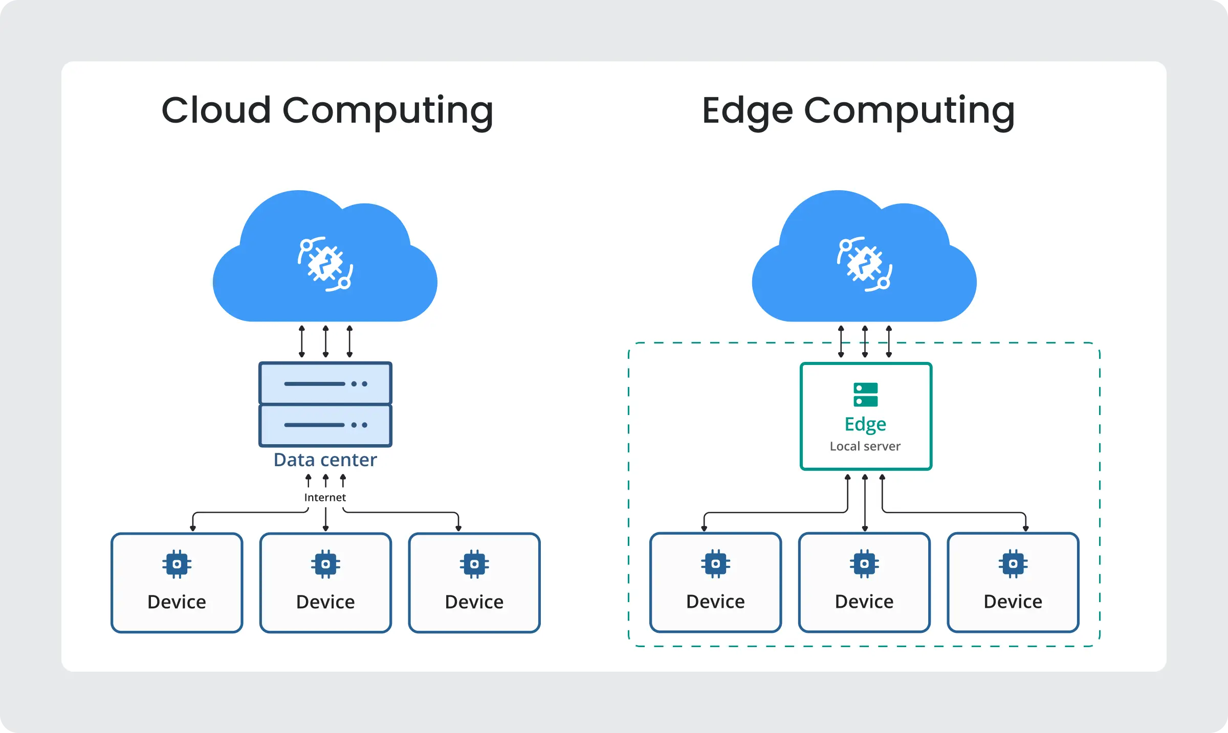 - Edge processes data locally, prioritizing speed and autonomy.