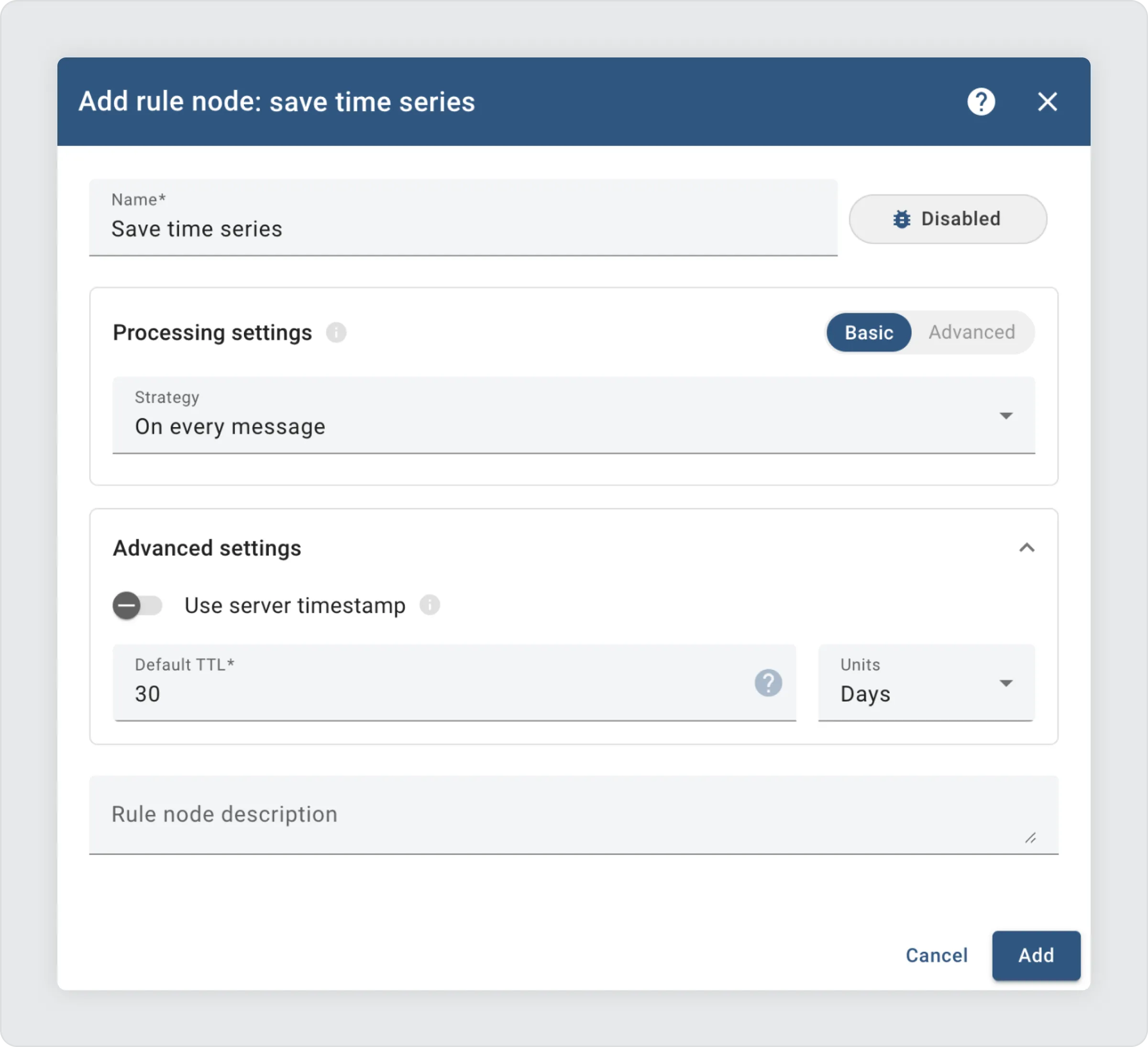 While aggregated data is preserved for long-term use, the raw telemetry should only be kept as long as it is operationally useful. In ThingsBoard, this is configured by setting the Default TTL in the save time series rule node within your rule chain.