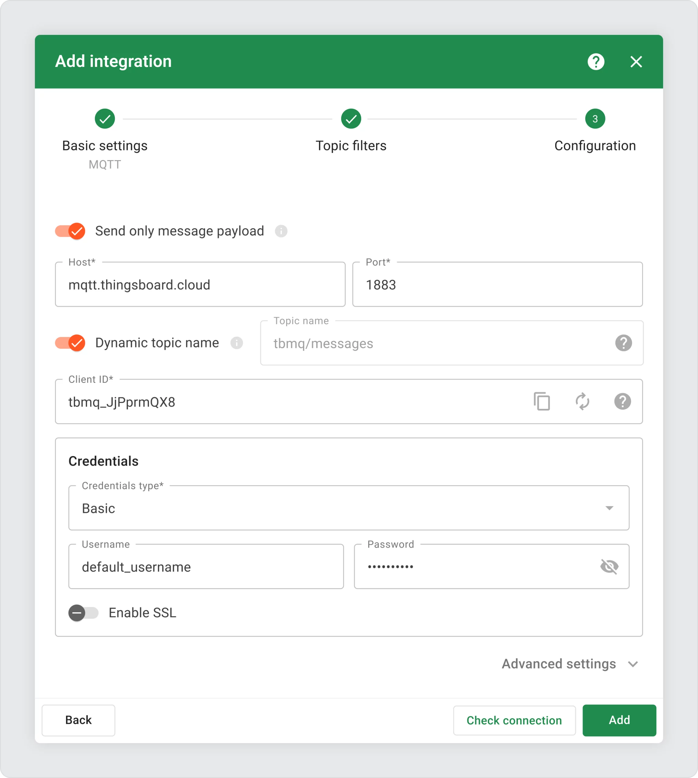 Each integration is easy to configure through the TBMQ Web UI or REST API. You can define topic filters, connection parameters, and enable/disable integrations independently. When messages match the defined filters, they’re automatically routed to the correct external system, all handled asynchronously through the Integration Executor microservice.