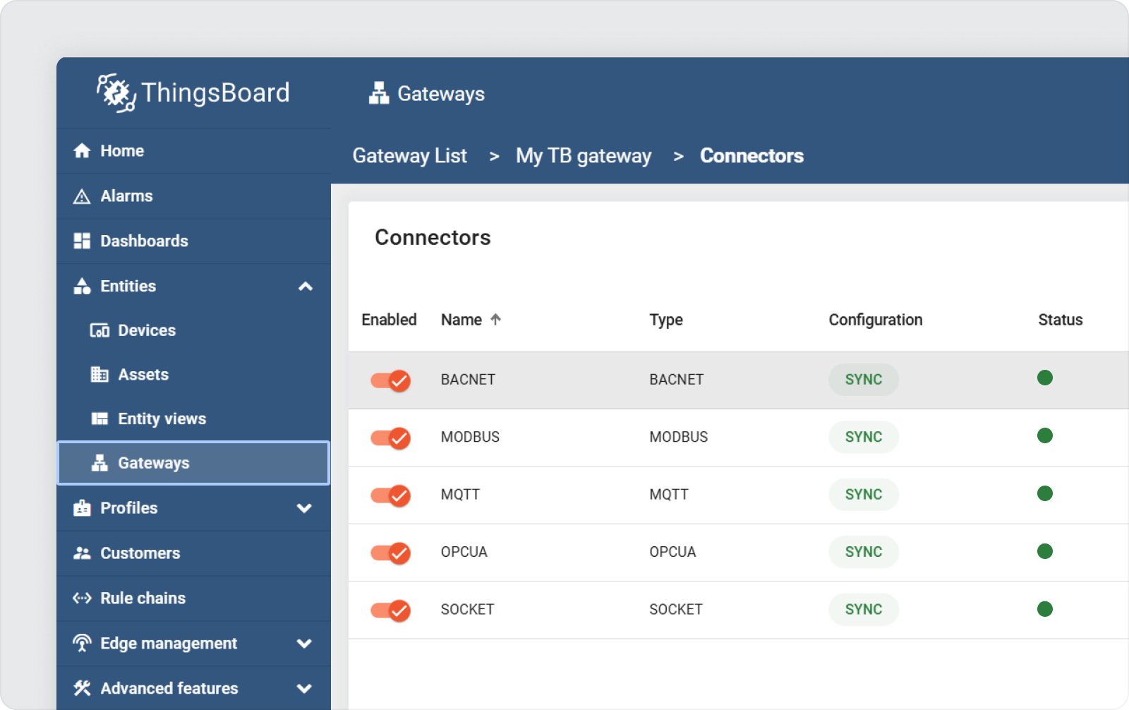 The ThingsBoard Gateway management dashboard has been relocated to a dedicated menu item under the Entities section. This allows us to update the gateway management dashboard independently of the core ThingsBoard release cycle, ensuring that users always have access to the latest features, bug fixes, and optimizations. If your ThingsBoard instance is connected to the internet, dashboard updates will be automatically applied.