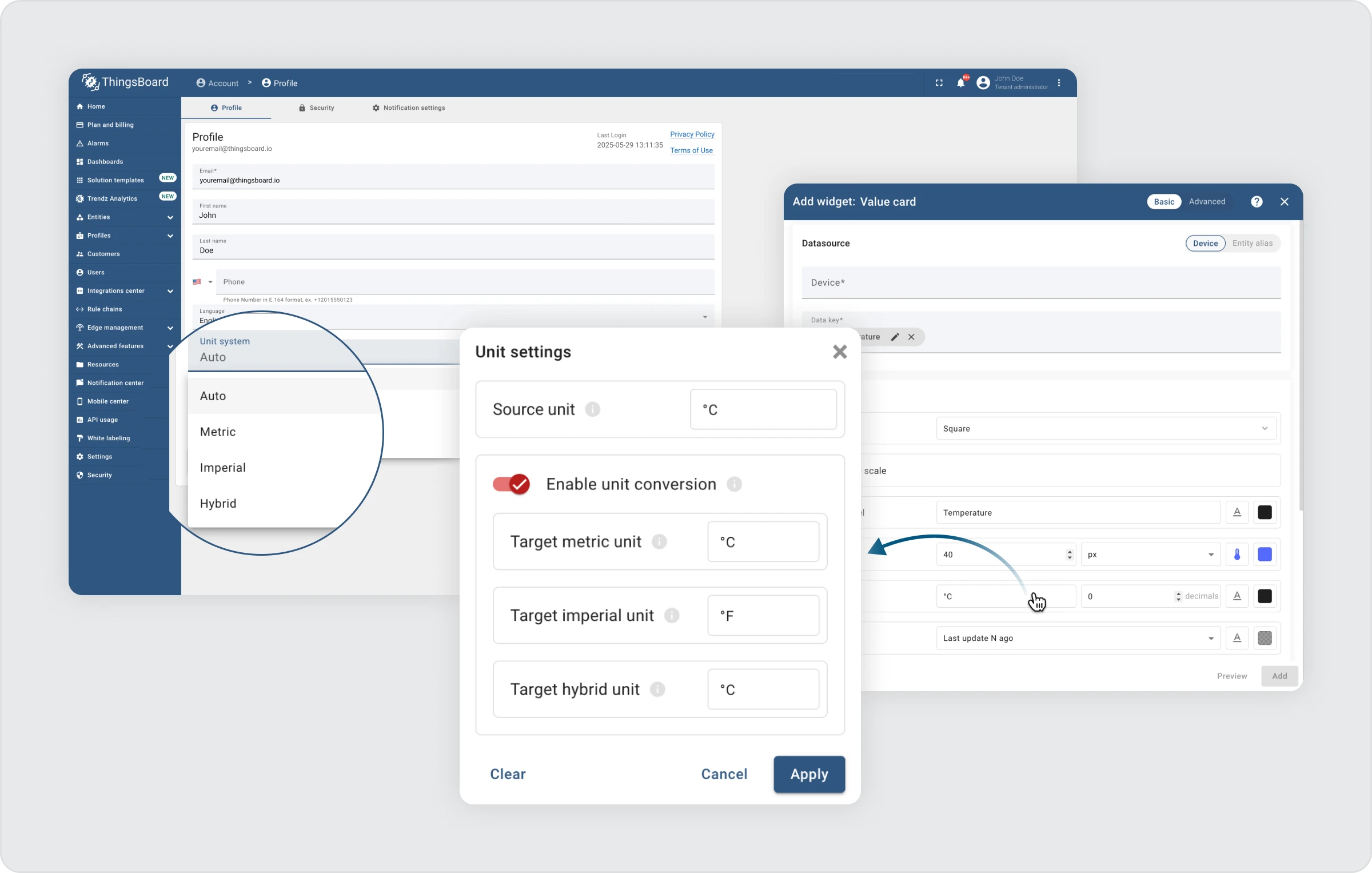 Forget about manual conversions and duplicate widgets! Starting with version 4.1, ThingsBoard automatically converts data between metric and imperial units. Whether it’s Celsius or Fahrenheit, kilometers or miles — set it once and it works everywhere.