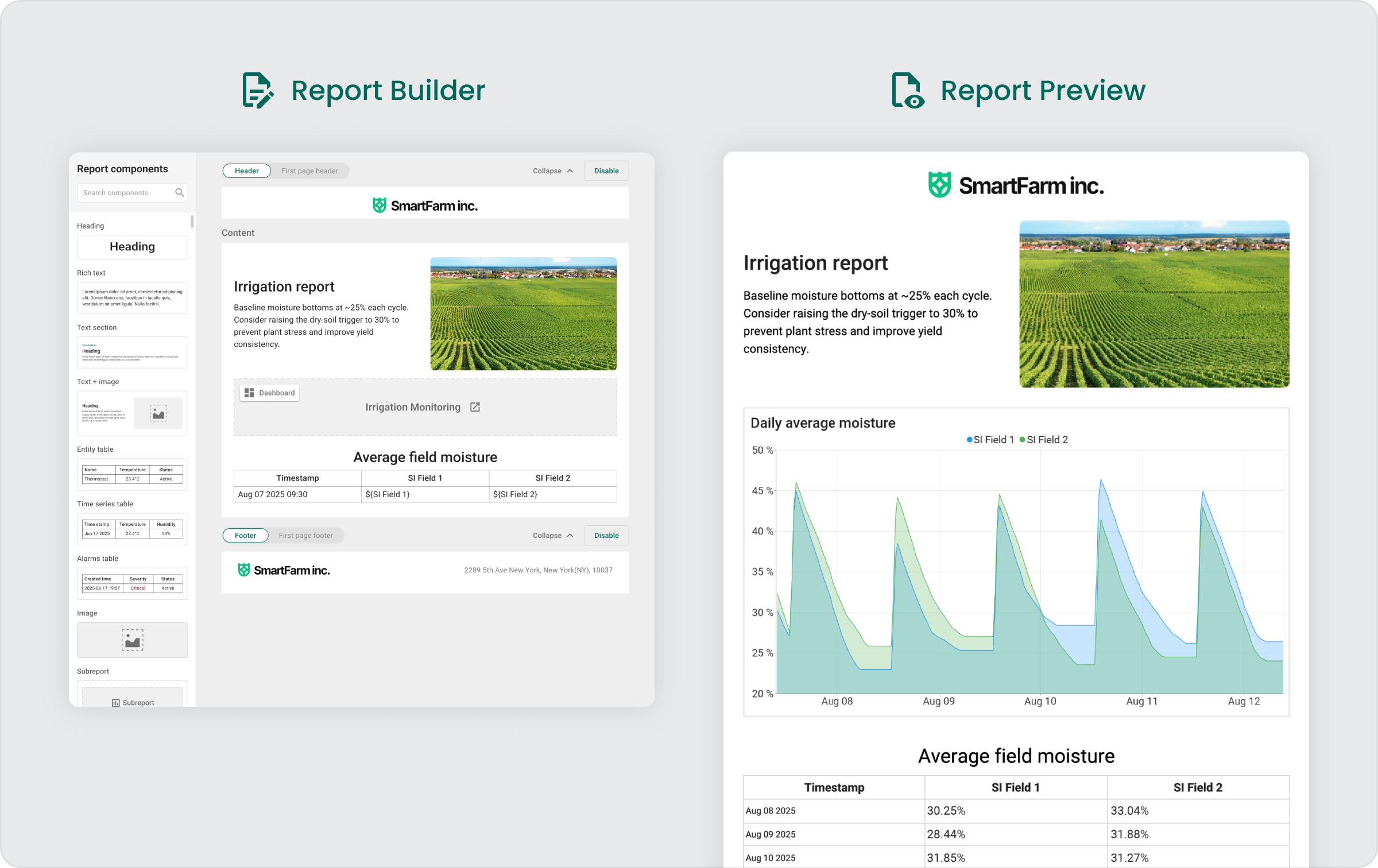 ThingsBoard 4.2 introduces Reporting 2.0 — a powerful, fully redesigned reporting engine that combines visual editing, reusable templates, and automated delivery. With Reporting 2.0, you can create stunning PDF and CSV reports using a drag-and-drop editor — no coding required.